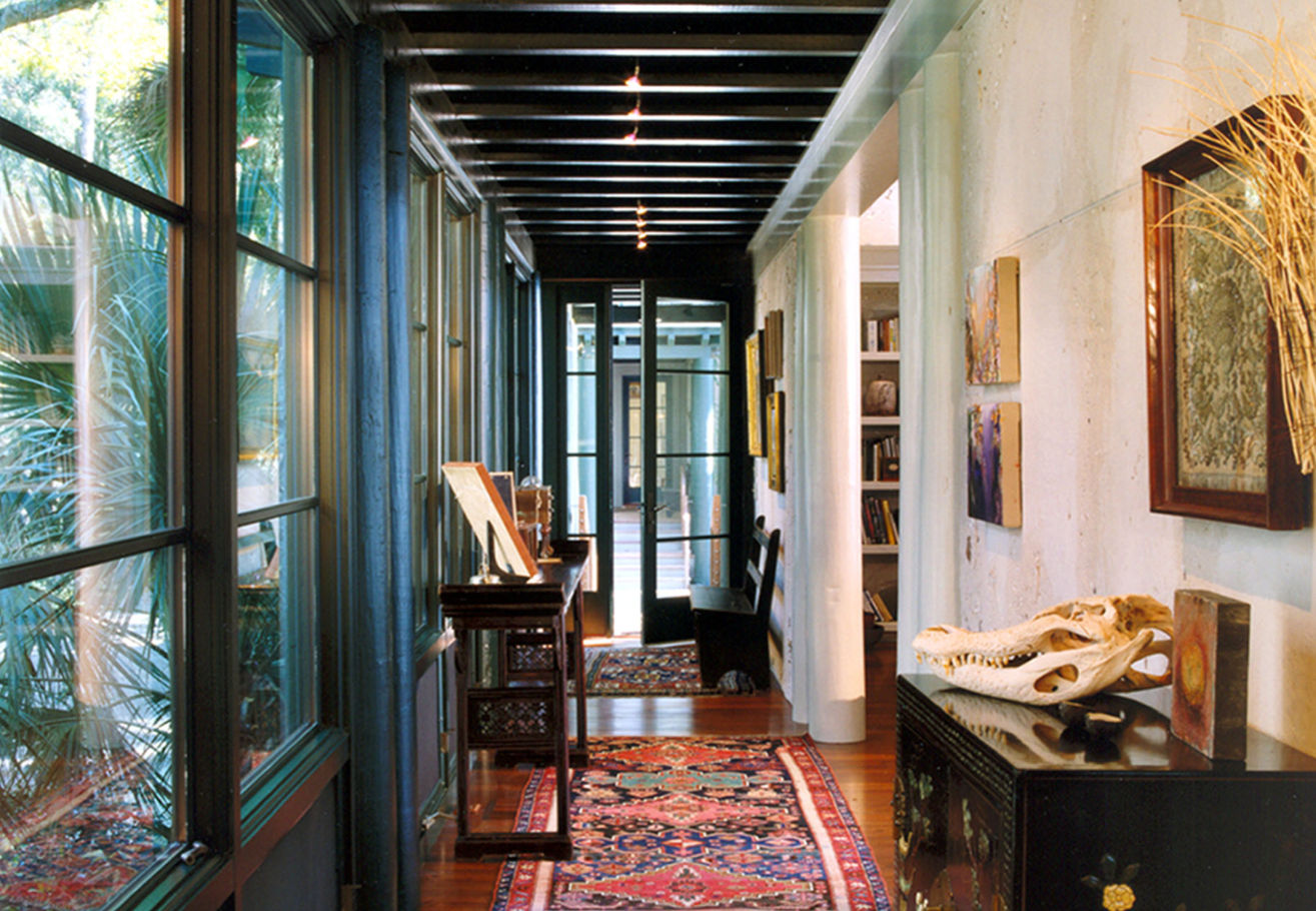 A linear design was the obvious solution to a long linear lot with many desirable trees. A long trellis spine creates a path to the entrance, and functions as the back bone of this home. The tabby structures are in reference to the ruins found on Spring Island.